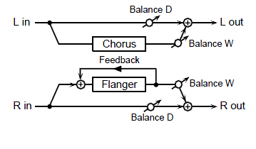 コーラスとフランジャーを並列に接続しています。設定項目は「37:CHORUS → FLANGER」と同じです。