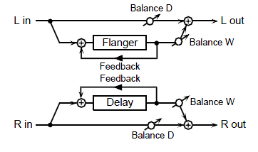 フランジャーとディレイを並列に接続しています。設定項目は「36:FLANGER → DELAY」と同じです。