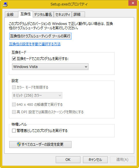 あらかじめダウンロードし解凍した中にある、Setup.exeのプロパティを開き、上のように「互換モードでこのプログラムを実行する」にチェックをいれてWindows Vistaを選択する。 あとは、通常のインストール方法でインストールできる。